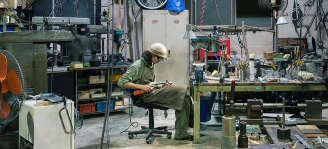 ベルトサンダーという工具を使い、ラグ(自転車の継ぎ手)の形を整え成形している作業中